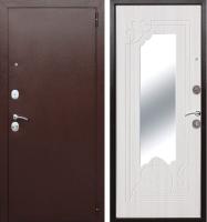 Дверь металлическая входная. Прокатный короб из холоднокатанной стали 1,5 мм. Толщина металла полотна 1,5 мм. Толщина полотна 60 мм. Наполнение полотна: минеральная вата. Короб закрытый, также утеплен минеральной ватой. Основной замок Гардиан 3011, дополнительный замок Гардиан 3201. Цилиндровый механизм Apecs (хром) ключ+вертушок. Накладка Apecs (хром). Ручка Apecs (хром). 3 противосъемных ригеля. 2 контура уплотнения. Уплотнитель изготавливается из резиновых смесей на основе EPDM каучуков. Внутренняя панель фрезерованная МДФ 12 мм. с зеркалом, покрытие экошпон.