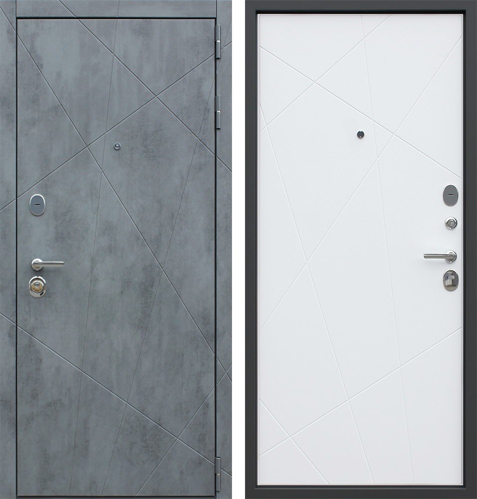 Дверь металлическая входная. Прокатный короб из холоднокатанной стали 1,5 мм. Толщина металла полотна 1,5 мм. Толщина полотна 102 мм. Наполнение полотна: минеральная вата Tisma Aquastatik + базальтовая плита Euroizol ECO 30. Короб закрытый, также утеплен базальтовой плитой. Основной замок Гардиан 3211 цилиндровый, дополнительный замок Гардиан 3001 сувальдный. Цилиндровый механизм Avers хром ключ+вертушок. Накладка на цилиндровый механизм овальная хромированная. Накладка на сувальдный замок овальная хромированная с автошторками. Ручка хромированная на круглом основании. 3 противосъемных ригеля. 3 контура уплотнения. Уплотнитель изготавливается из резиновых смесей на основе EPDM каучуков. Наружная отделка: фрезерованная МДФ панель 10 мм., покрытие экошпон, цвет бетон тёмный. Внутренняя отделка: фрезерованная МДФ панель 10 мм., покрытие экошпон, цвет муар белый.