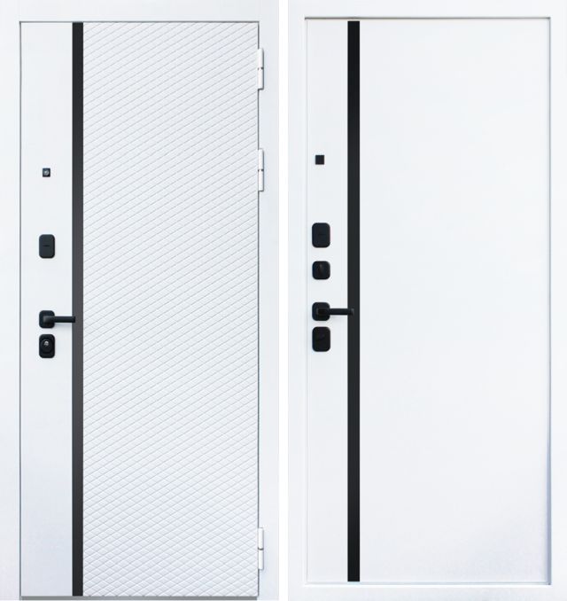 Дверь металлическая входная. Прокатный короб из холоднокатанной стали 1,5 мм. Толщина металла полотна 1,5 мм. Толщина полотна 102 мм. Наполнение полотна: минеральная вата Tisma Aquastatik + базальтовая плита Euroizol ECO 30. Короб закрытый, также утеплен базальтовой плитой. Основной замок Гардиан 3211 цилиндровый, дополнительный замок Гардиан 3001 сувальдный. Цилиндровый механизм Avers хром ключ+вертушок. Накладка на цилиндровый механизм квадратная чёрная. Накладка на сувальдный замок квадратная чёрная с автошторками. Ручка чёрная на квадратном основании. 3 противосъемных ригеля. 3 контура уплотнения. Уплотнитель изготавливается из резиновых смесей на основе EPDM каучуков. Наружная отделка: фрезерованная МДФ панель 10 мм., с вставкой из чёрного стекла, покрытие экошпон, цвет муар белый. Внутренняя отделка: фрезерованная МДФ панель 10 мм., с вставкой из чёрного стекла, покрытие экошпон, цвет муар белый.