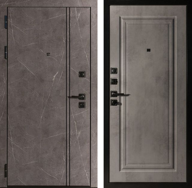 Дверь металлическая входная. Прокатный короб из холоднокатанной стали 1,5 мм. Толщина металла полотна 1,5 мм. Толщина полотна 102 мм. Наполнение полотна: минеральная вата Tisma Aquastatik + базальтовая плита Euroizol ECO 30. Короб закрытый, также утеплен базальтовой плитой. Основной замок Гардиан 3211 цилиндровый, дополнительный замок Гардиан 3001 сувальдный. Цилиндровый механизм Avers хром ключ+вертушок. Накладка на цилиндровый механизм квадратная чёрная. Накладка на сувальдный замок квадратная чёрная с автошторками. Ручка чёрная на квадратном основании. 3 противосъемных ригеля. 3 контура уплотнения. Уплотнитель изготавливается из резиновых смесей на основе EPDM каучуков. Наружная отделка: фрезерованная МДФ панель 10 мм., с вставкой из чёрного молдинга, покрытие экошпон, цвет мрамор. Внутренняя отделка: фрезерованная МДФ панель 10 мм., покрытие экошпон, цвет бетон серый.