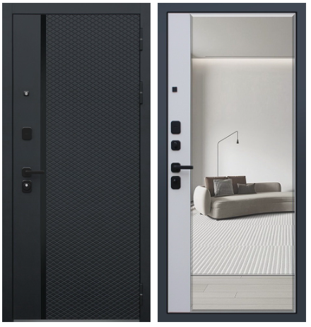Дверь металлическая входная. Прокатный короб из холоднокатанной стали 1,5 мм. Толщина металла полотна 1,5 мм. Толщина полотна 105 мм. Наполнение полотна: минеральная вата Tisma Aquastatik + базальтовая плита Euroizol ECO 30. Короб закрытый, также утеплен базальтовой плитой. Основной замок Гардиан 3211 цилиндровый, дополнительный замок Гардиан 3001 сувальдный. Цилиндровый механизм Avers хром ключ+вертушок. Внутренняя накладка на цилиндровый механизм квадратная черная. Наружная врезная броненакладка черного цвета. Накладка на сувальдный замок квадратная черная с автошторками. Ручка черная на квадратном основании. 3 противосъемных ригеля. 3 контура уплотнения. Уплотнитель изготавливается из резиновых смесей на основе EPDM каучуков. Наружная отделка: фрезерованная МДФ панель 10 мм. с вставкой из чёрного стекла лакобель, покрытие экошпон, цвет муар чёрный. Внутренняя отделка: МДФ панель 16 мм. с зеркалом во весь рост, покрытие экошпон, цвет муар белый.