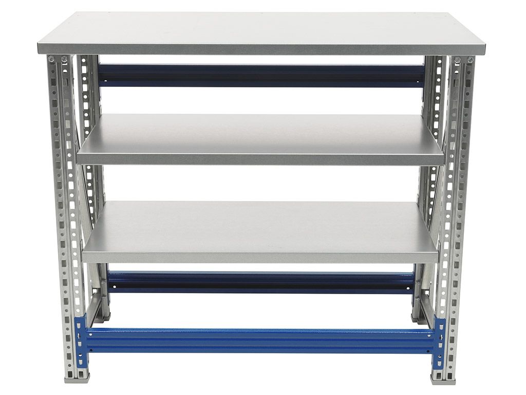 - Основные элементы верстака (опоры, полка, накладка на столешницу) изготовлены из оцинкованной стали, что позволяет устанавливать его в местах с повышенной влажностью.