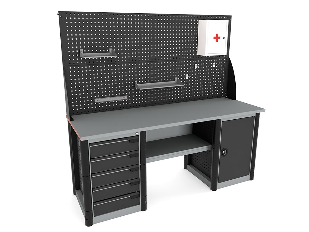 - Боковые перфорированные стенки тумбы и опоры позволяют размещать на них различные стандартные аксессуары